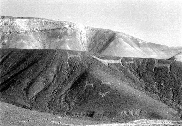 Se notan claramente siluetas de camélidos entre uno a cuatro metros de largo, la mayoría orientados hacia el este, algunos con carga, figuras de humanos, ¿allí hay un báculo? existen otros símbolos que sugieren propósitos mágico religiosos. Hacia el este del panel hay un camélido con sus cuatro patas visibles, muy raro en este tipo de geoglifos.