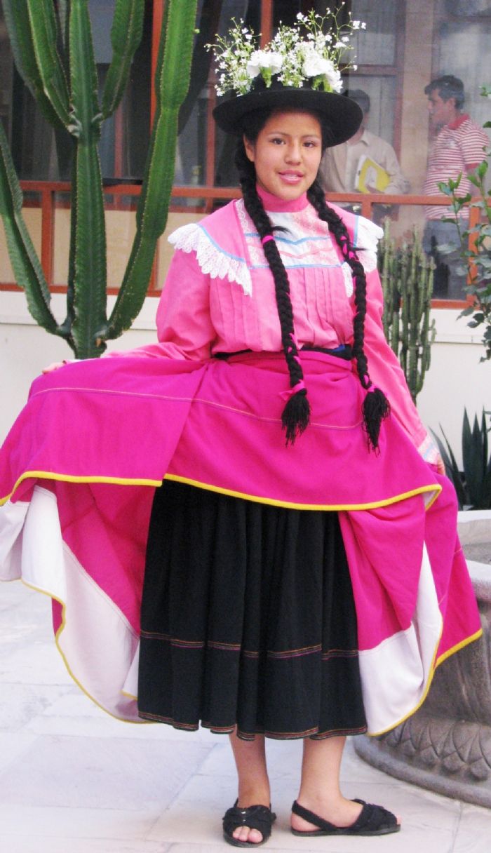 Visten una pollera negra, sobre ella llevan una pollera de color rojo, ambas sujetas por una faja tejida, angosta y multicolor terminadas en borlas que dan colorido al atuendo. La pollera roja se recoge delante de tal manera que puede verse la pollera negra interior, generándose un hermoso contraste.