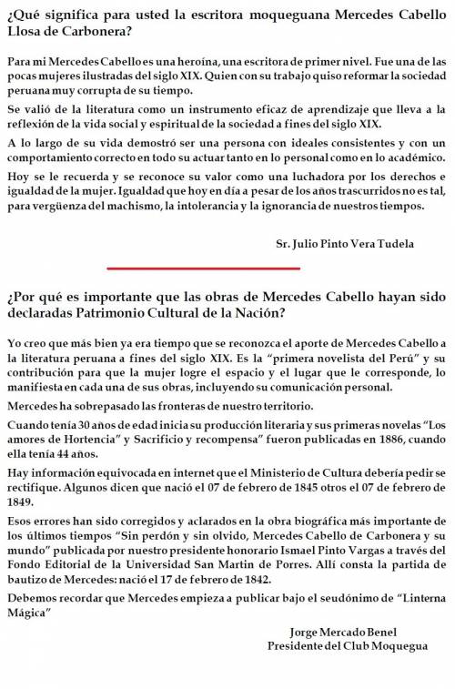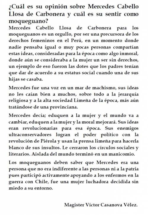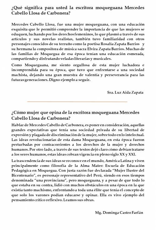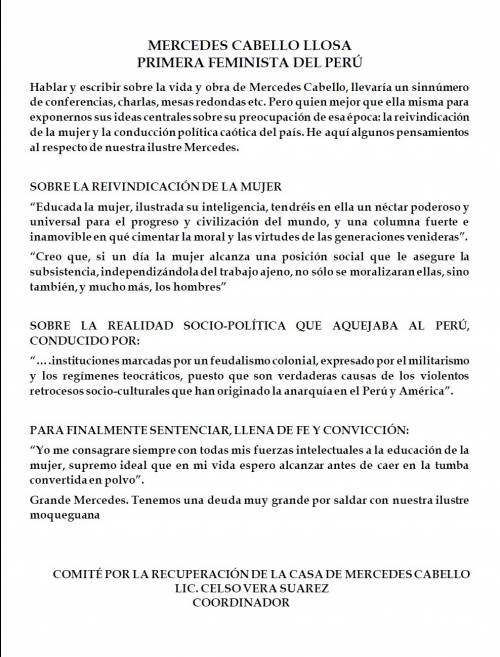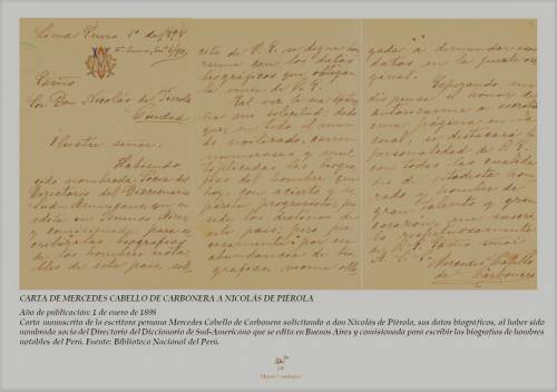 Mercedes Cabello fue la primera escritora peruana cuyos artículos y ensayos se podían leer en otros países como Argentina, España y Cuba.